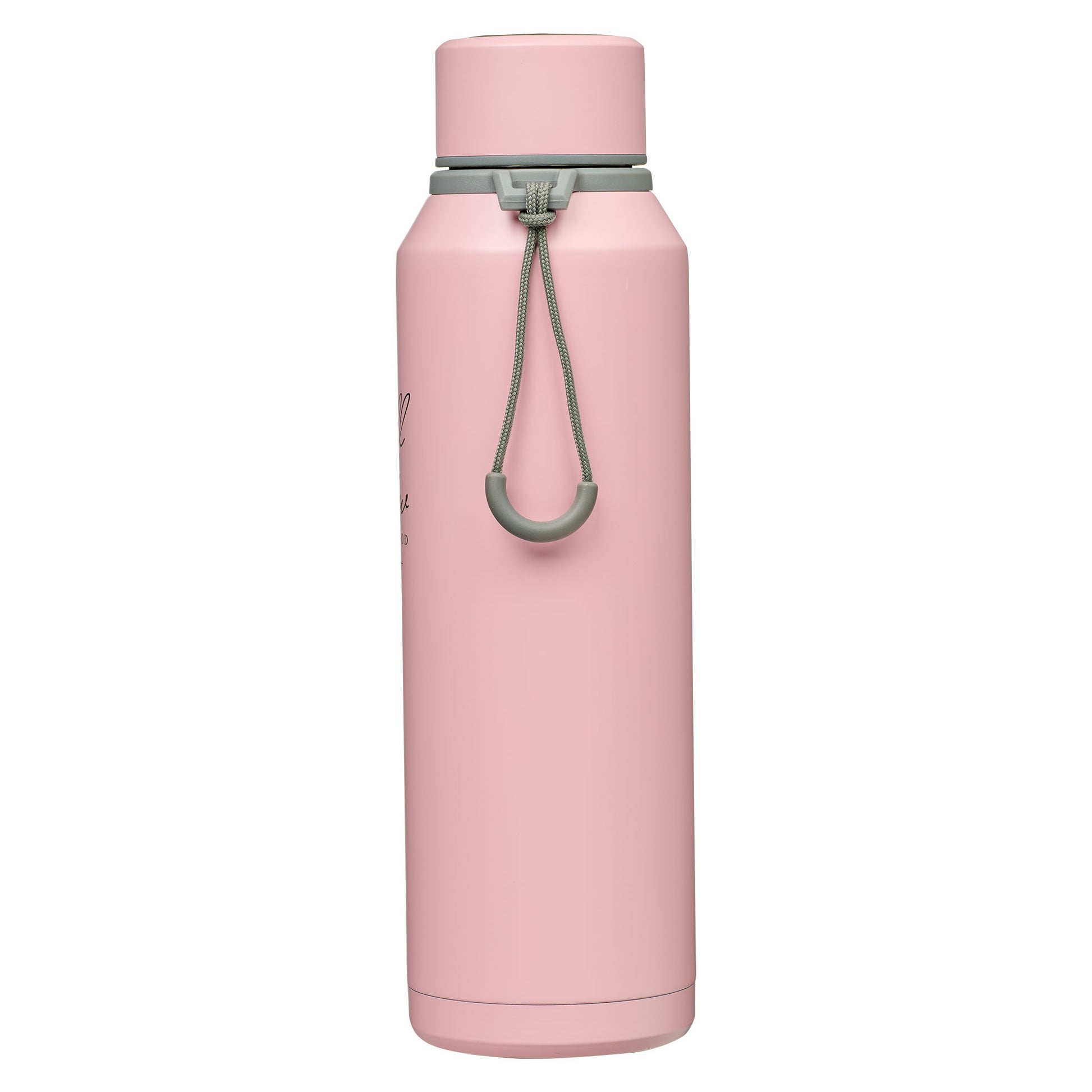 The pretty pink matte exterior of the stainless steel water bottle is laser-engraved with the sentiment. The sentiment is presented in a silver multi-font design.