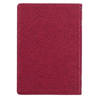 The front and back covers of the berry-colored faux leather Bible are heat-debossed with a swirly fern design. A smooth faux leather patch that carries the gold-foiled title is appliquéd on the front cover.