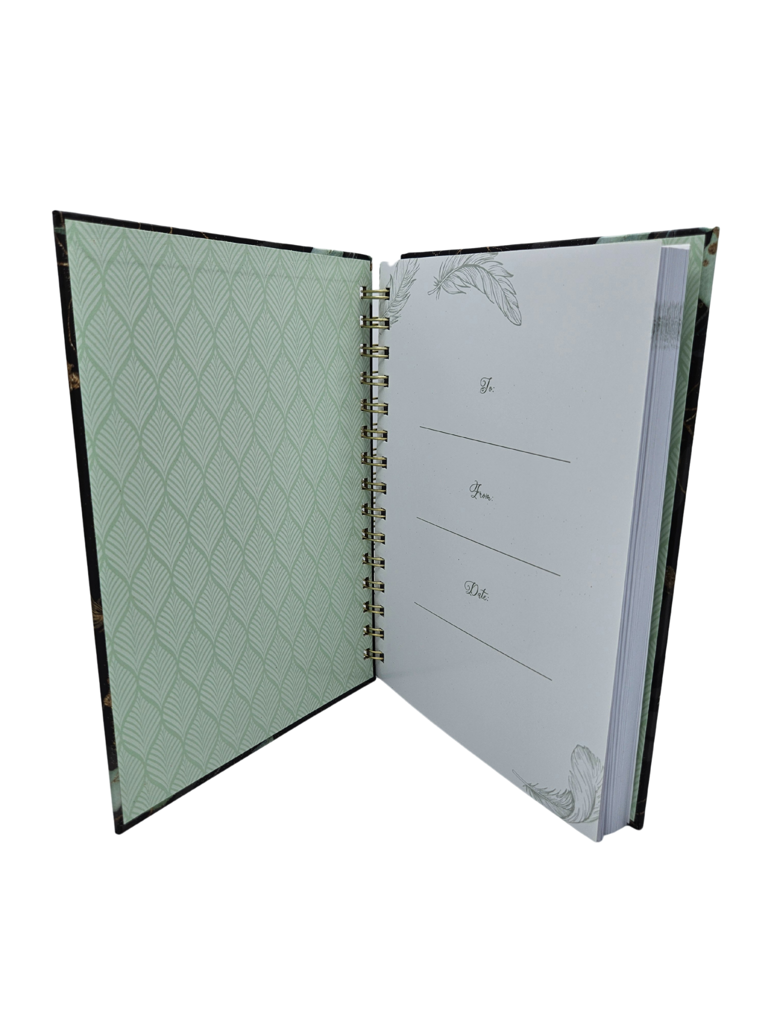 Gold foil outlined feathers, and watercolored teal leaves adorn the covers of this stunning spiral-bound journal. The sentiment is displayed in gold foiled letters in a multi-font design.