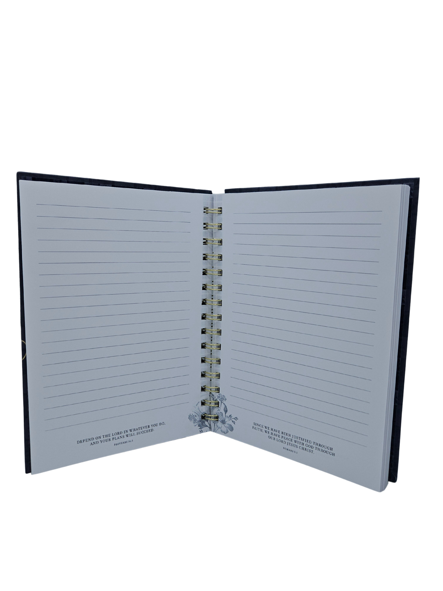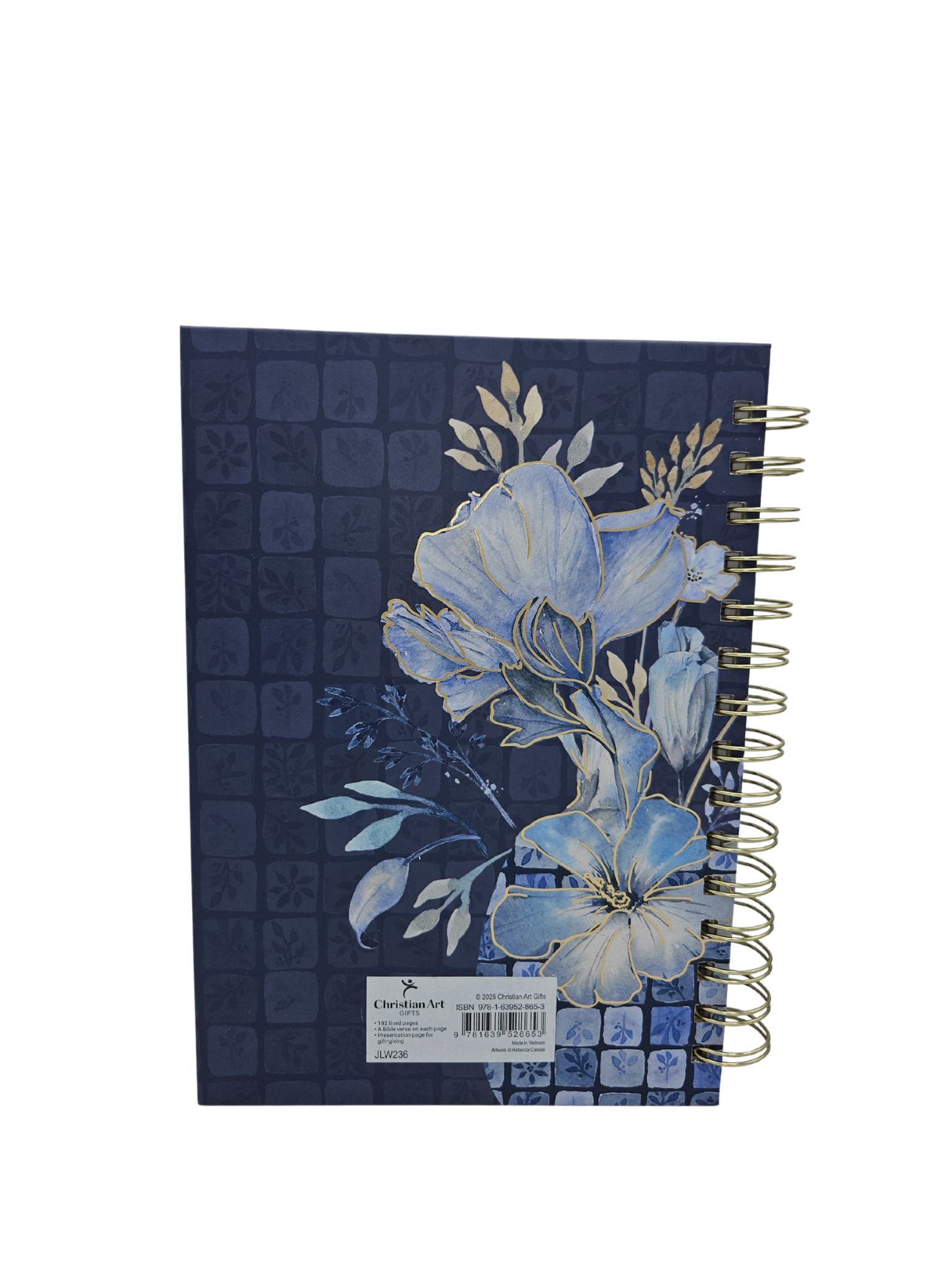 The durable double gold-wire binding allows the journal to open completely flat. Additional Scripture verses are located on each interior page. All pages are lined and offer plenty of space for journaling. A small blue floral design embellishes the lower inner corners of each page. A presentation page at the front provides a space to personalize the journal.