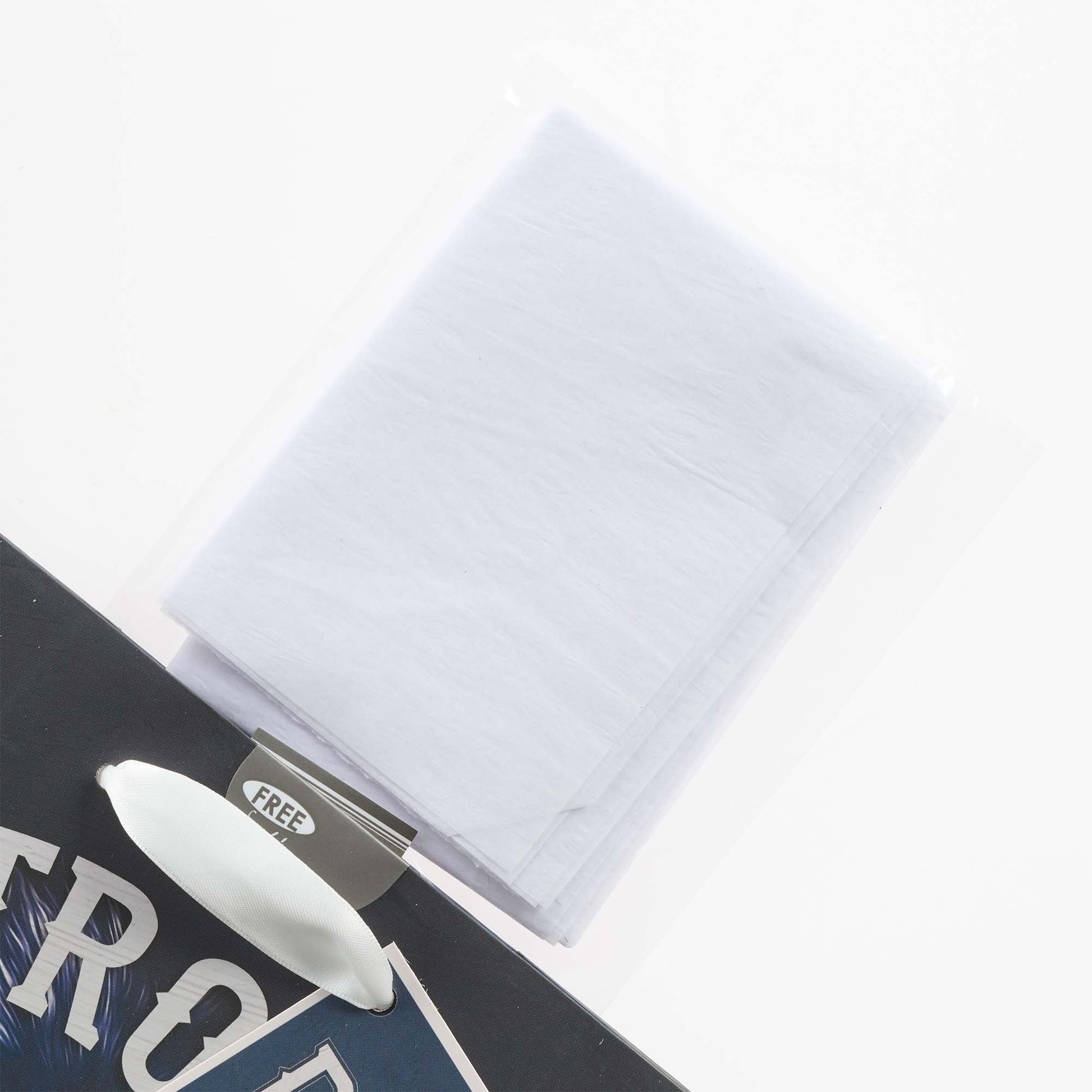 White satin ribbon handles and two white sheets of tissue paper compliment the light gray lettering in the design. An attached gift card makes it clear that this gift bag is intended for one person only.