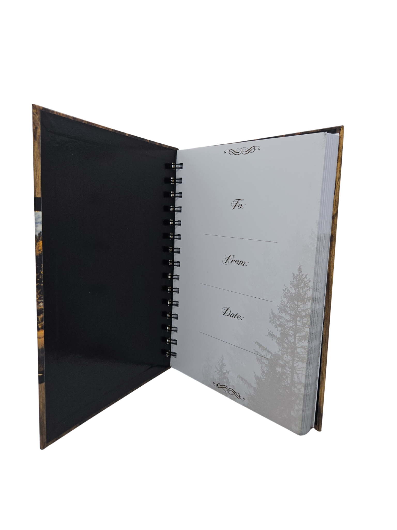 The covers of the spiral-bound journal feature a woodgrain motif in the background. Thick brown borders separate a peaceful image of a valley with a lake and a mountain superimposed on the woodgrain background.