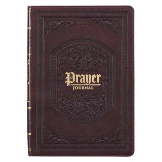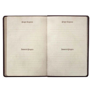 The rich dark brown faux leather cover of the prayer journal is heat-debossed with an elaborate scrollwork frame surrounding an equally elaborately decorated vignette filled with more heat-debossed scrollwork. The vignette holds the gold foiled title of the journal in an antiquated gold foiled script.