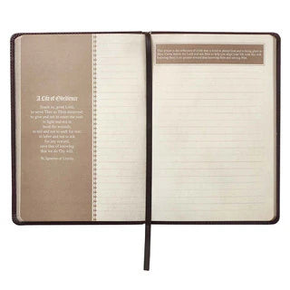 A presentation page in the prayer journal's front allows you to dedicate this journal to a friend. There is space for names, date and a short message. A lay-flat binding enables the journal to open completely flat and makes writing in it more comfortable. A brown satin ribbon marker will let you mark your last entry, and gilt-edged pages protect the page ends from dust.
