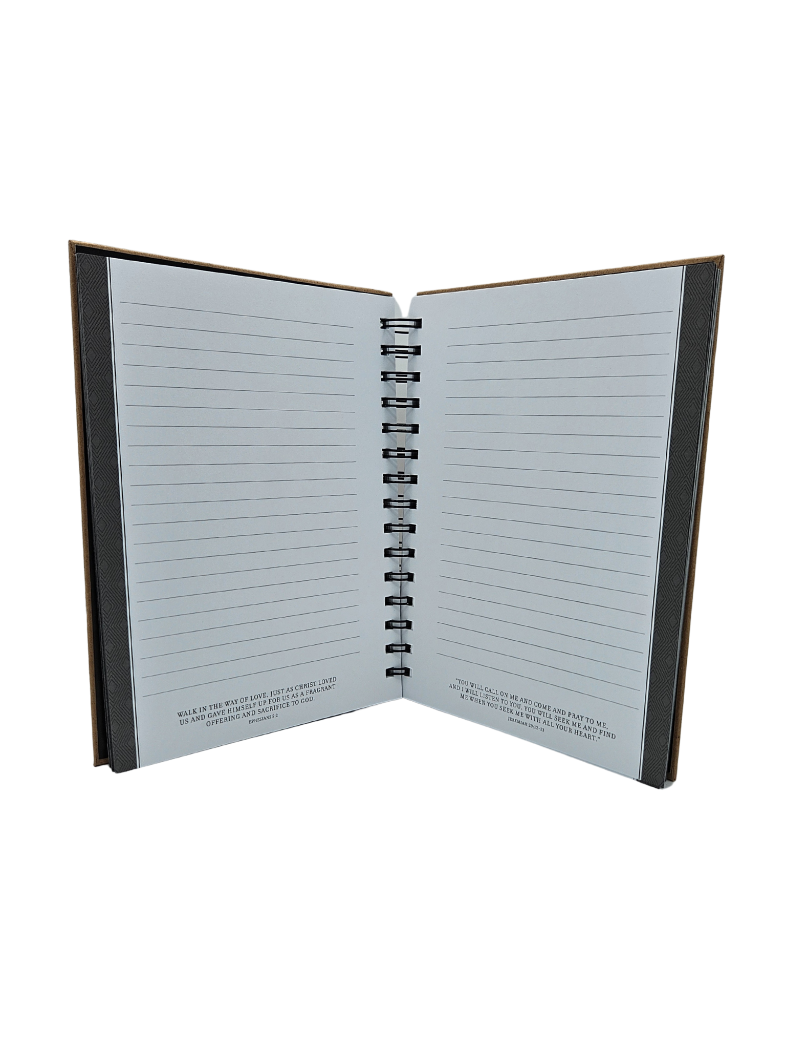 The cork-brown cover of the spiral journal has a matte texture similar to kraft paper. It's framed by a double gold-foiled border that encloses a charcoal gray, diamond-shaped geometric design. A diagonal band, outlined in gold foil, cuts across the design, showcasing the sentiment in charcoal debossed letters. Below this design, a medallion displays the Scripture reference in gold foil and charcoal.